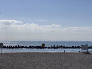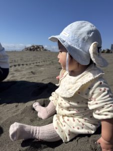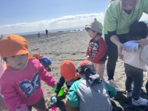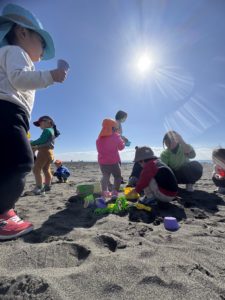 「サラサラなお砂だよね~🏖️」と先生たちとお話しながら